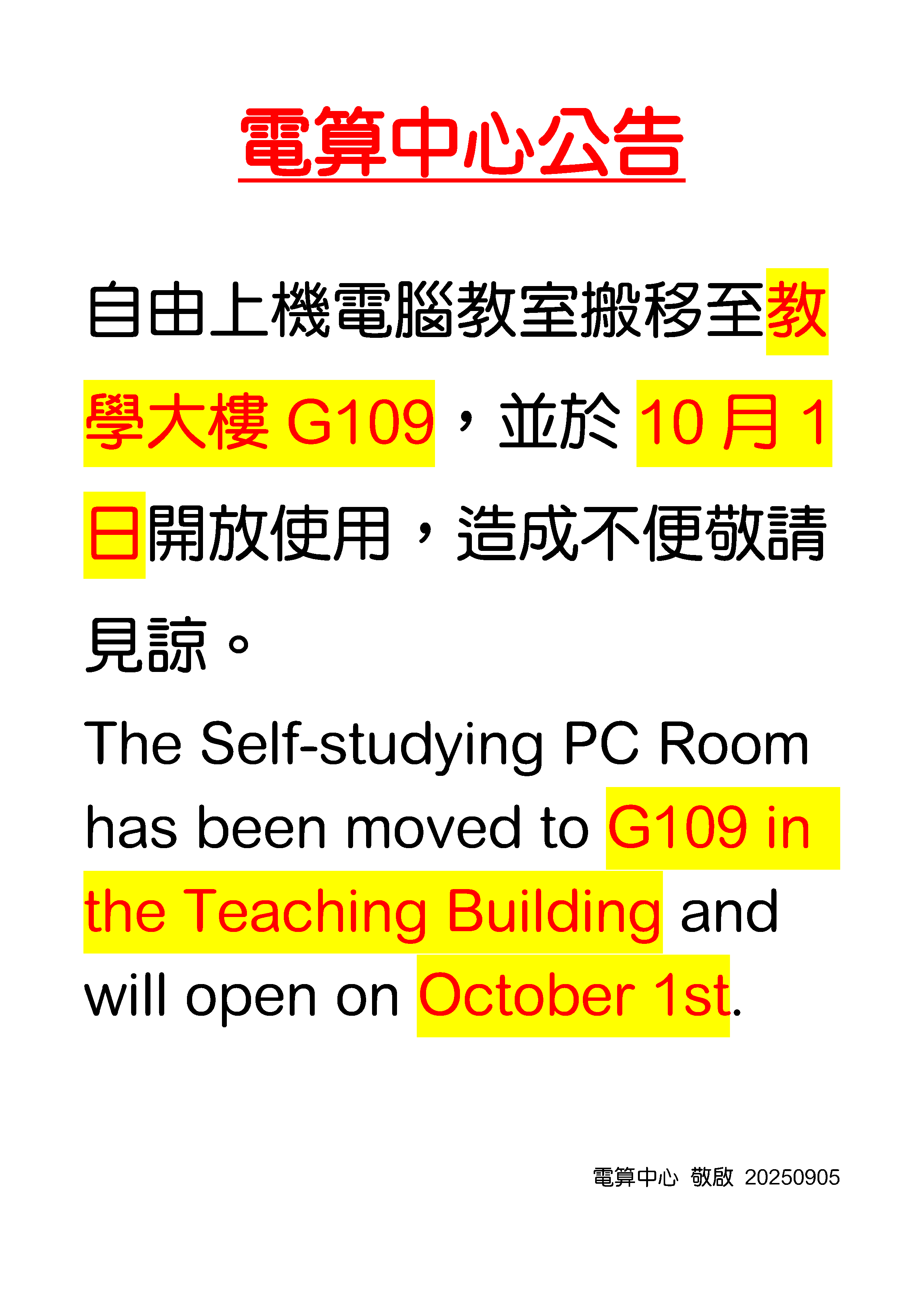 【電腦教室】自由上機電腦教室搬移至教學大樓G109,並於10月1日開放使用